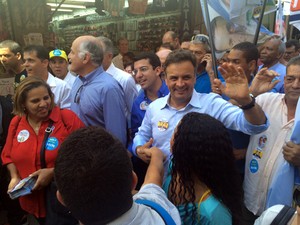 , comparou a política e as eleições ao mar, quando questionado em entrevista a uma rádio do Rio de Janeiro sobre o desempenho de Marina Silva (PSB) na disputa eleitoral. Na resposta, Aécio disse que "ondas vêm".O candidato falou para a rádio da Saara, maior centro de comércio de rua do Rio. Na última pesquisa do instituto Datafolha, divulgada há uma semana, Marina tem 21% das intenções de voto e Aécio tem 20%. A presidente Dilma Rousseff